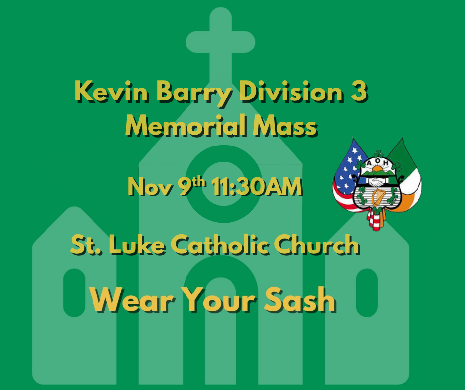 Our Annual AOH Memorial Mass for deceased AOH members will be held at St Luke Catholic Church located at 7575 Holliday Drive, Indianapolis on Sunday, November 9th, 11:30am. Deceased members we will be remembering this year are Brothers Michael J. Boyle, Thomas F. McAndrews and Brian J. McGinley.